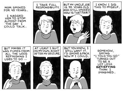 This sample of the book exemplifies Fies’ clever use of image and word.  The image aspect of this strip depicts his mom’s decreasing health through the cancer process.  The quote bubbles tell Mom’s different views of getting cancer from smoking.  The drawings send a message to the viewer, but without the words, the true meaning is lost.